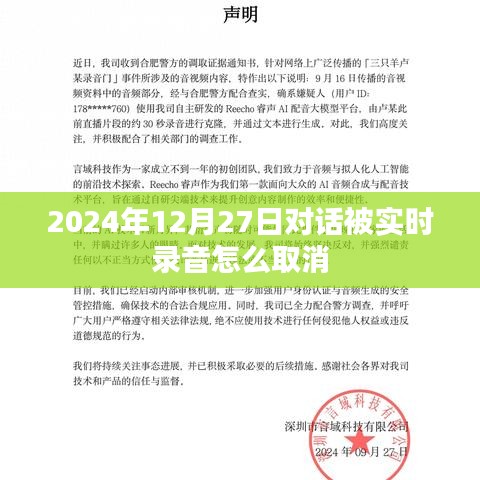 本文详细介绍了在2024年12月27日如何取消对话的实时录音功能,通过了解实时录音技术、取消步骤以及法律与道德考量,我们希望帮助你更好地保护个人隐私,不同设备和品牌可能有不同的操作方法,建议根据实际情况查阅相关文档或寻求专业帮助,我们也要在遵守法律和道德的前提下,合理使用和取消录音功能。